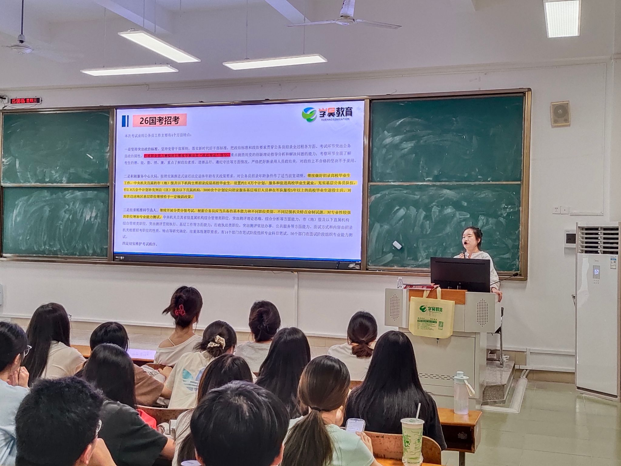 讲座中,老师深度解读2026年国家公务员考试公告,重点剖析政策与往年的关键差异,梳理国考报考完整流程,提醒报名关键时间节点,强调“仅能选择一个岗位”的规则。老师结合丰富经验,拆解2026年国家公务员考试岗位各项限制条件,通过柱状数据图呈现应往届身份、英语能力、学历、政治面貌、基层工作经历等核心要素分布,为不同背景同学提供针对性选岗思路。